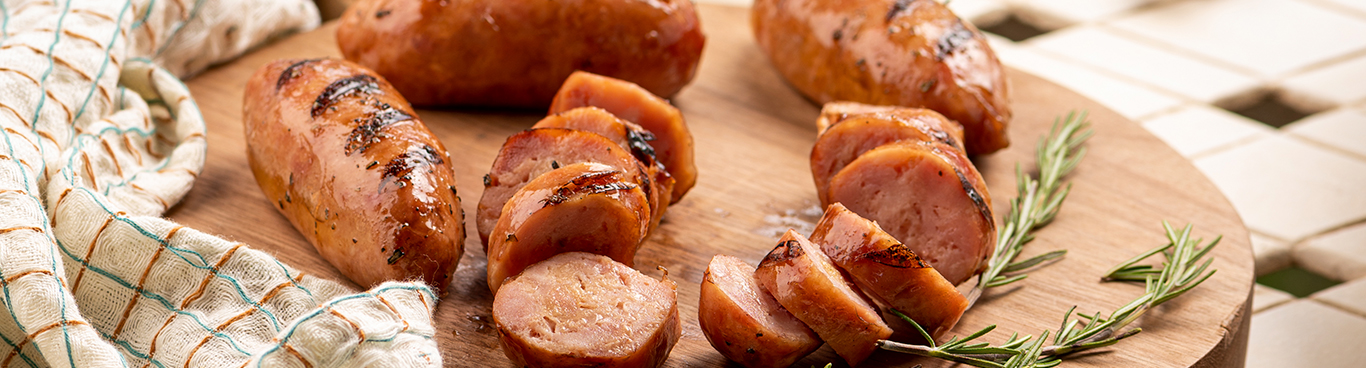 Linguiça de Frango recheada com bacon SuperFrango acompanhada de mandioca cremosa e alho frito